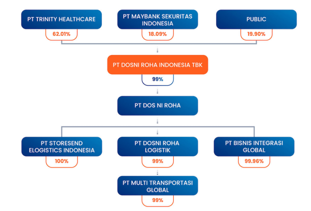 Secara struktur perusahaan, PT Dosna Roha Indonesia Tbk sahamnya dimiliki oleh PT Trinity Healthcare (62,01 persen), PT Maybank Sekuritas Indonesia (18,09 persen), dan publik (19,9 persen).